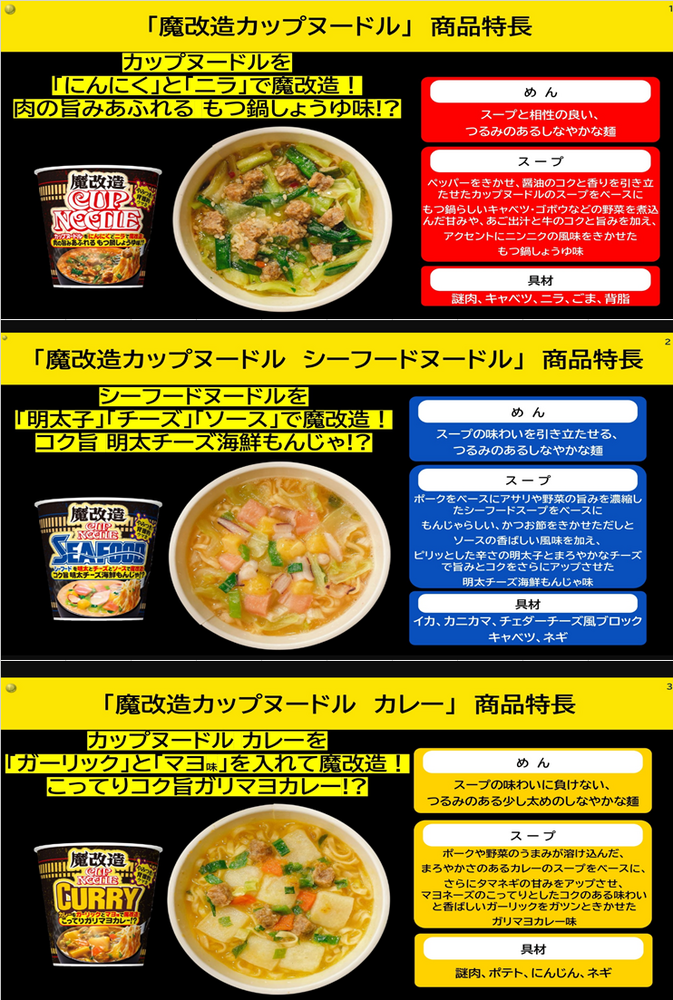 今回のお知らせは 「魔改造カップヌードル企画」 3種類のご案内です