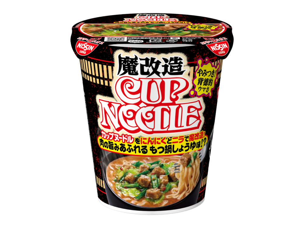 ●改造カップヌードル 「カップヌードル」のスープをベースに、 にんにくとニラの風味、肉の旨み、 野菜の甘みをきかせた "もつ鍋しょうゆ味"。 具材は、"謎肉"、キャベツ、ニラ、ごま、背脂