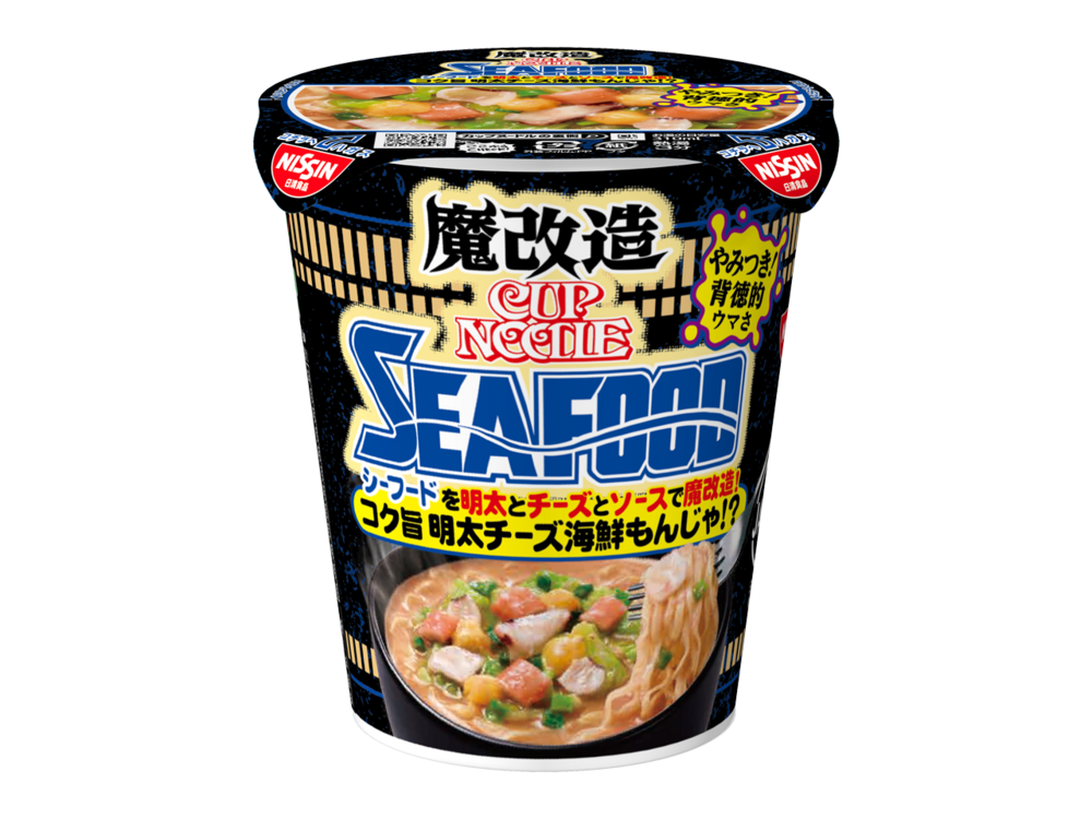 ●魔改造シーフード 「シーフードヌードル」のスープをベースに、 明太子とチーズの旨みとコク、 ウスターソースの香ばしい風味をきかせた "明太チーズ海鮮もんじゃ味" 。 具材は、イカ、カニカマ、チェダーチーズ風 ブロック、キャベツ、ネギ。