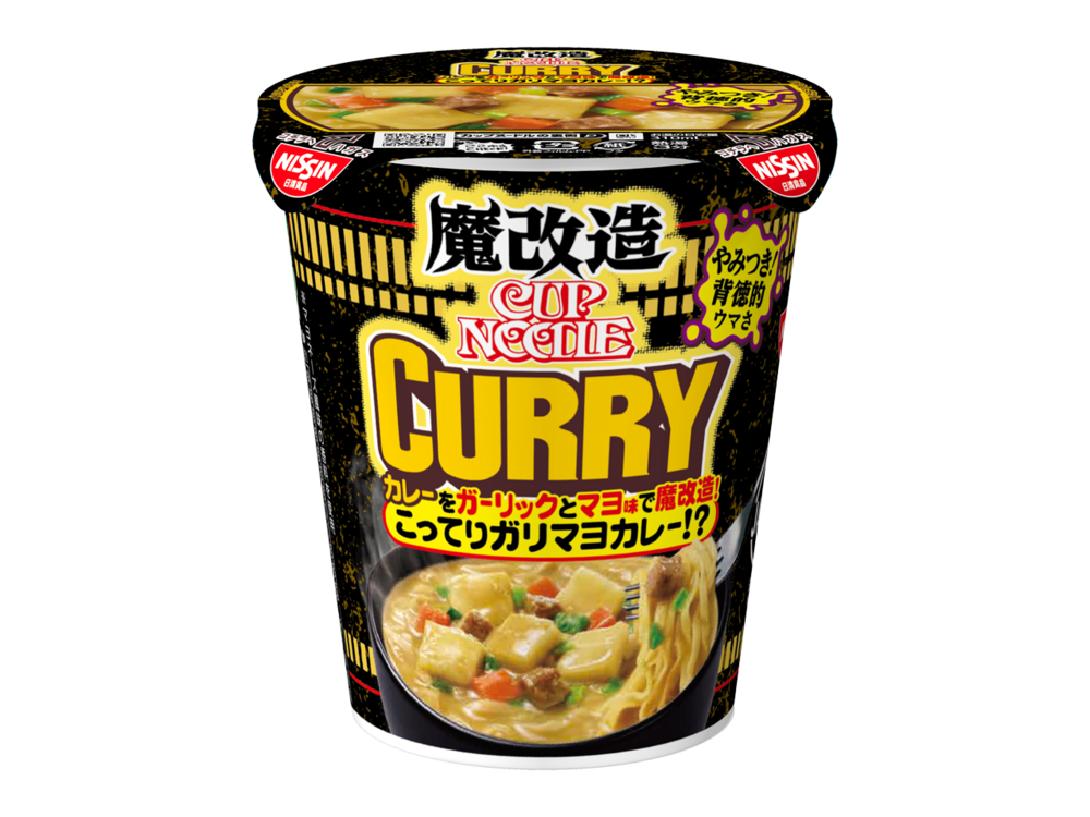 ●魔改造カップヌードルカレー 「カップヌードル カレー」のスープをベースに、 ガーリックの香ばしさ、マヨネーズの 風味を加えた "ガリマヨカレー味"。 具材は、"謎肉"、ポテト、ニンジン、ネギ。