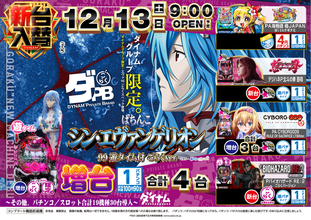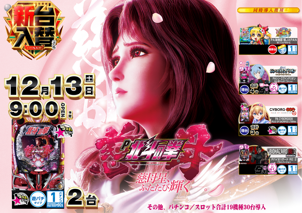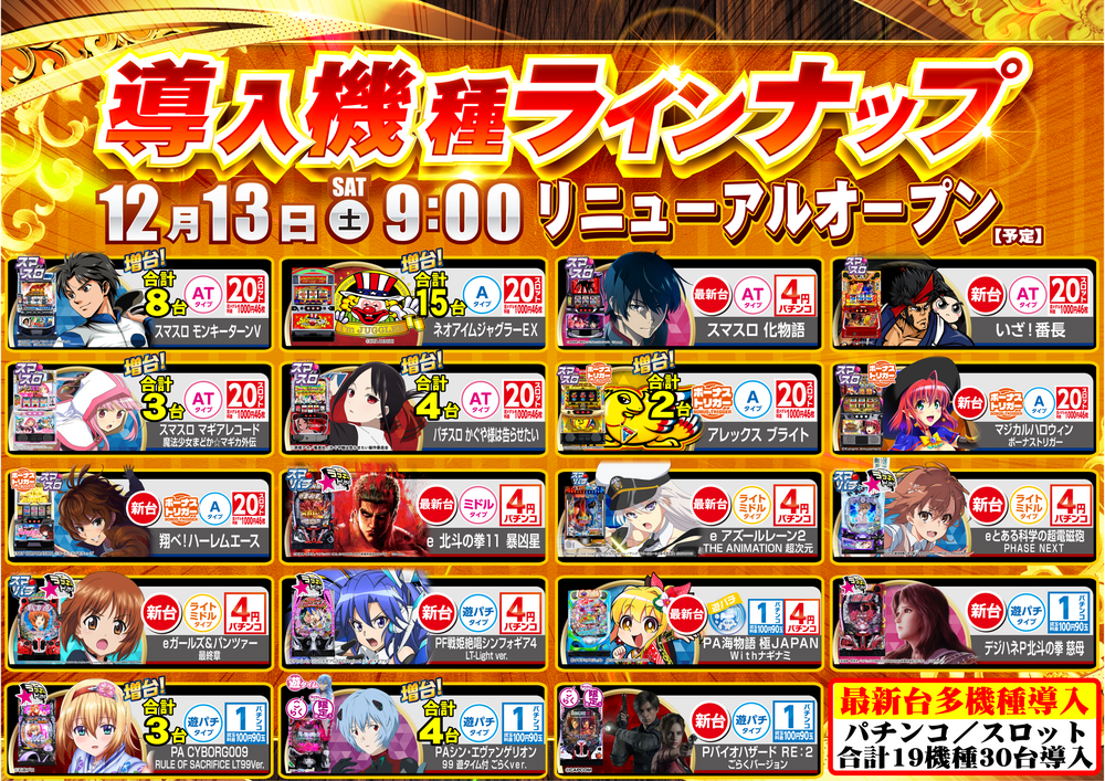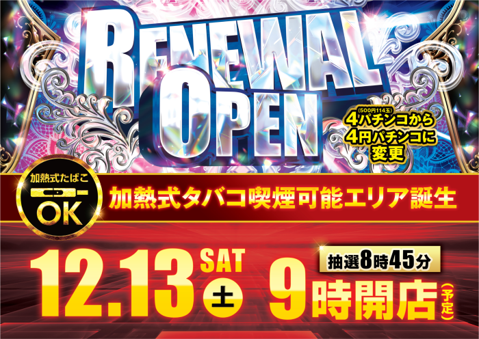 (予定) *今回「土曜日の新台入替」です! * ①スロットコーナー&パチンココーナーの一部、 加熱式タバコが喫煙出来る様になります ②貸玉変更 4パチンコ(¥100/114玉) 4円パチンコ(¥100/125玉) に変更します