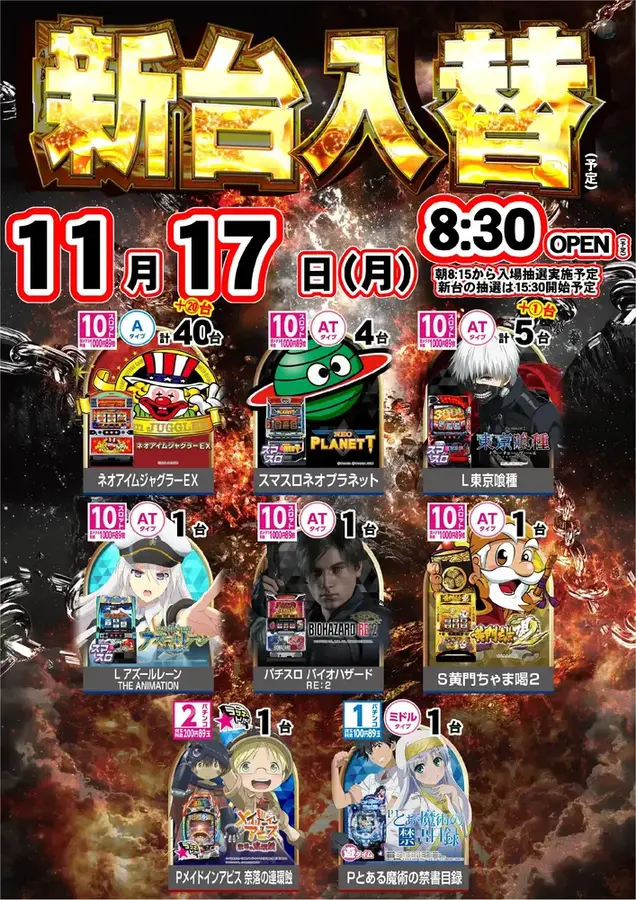 11月17日(月) 8:30OPEN(予定) 朝8:15から入場抽選