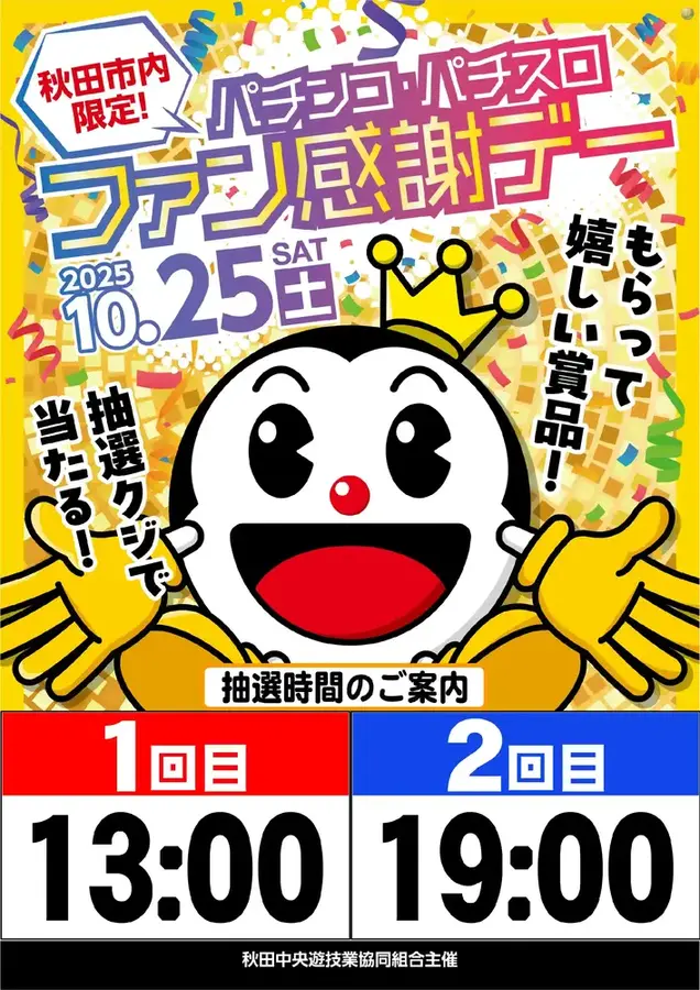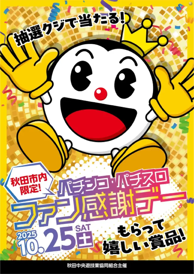 秋田市内限定 パチンコ・パチスロファン感謝デー を開催いたします お客様に楽しんで頂くため色々な賞品を ご用意させて頂きました