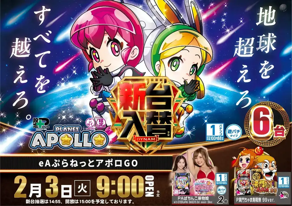 新台抽選は14:55、 新台開放は15:00を予定しております