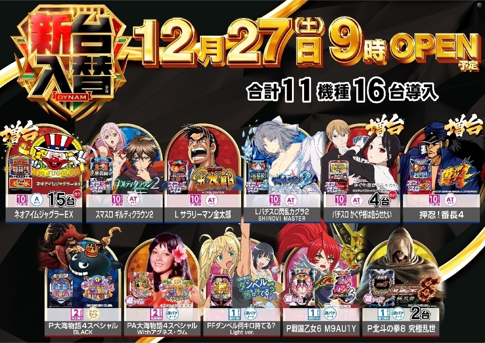 12月27日(土) 新台入替!! 全11機種16台導入(予定) |