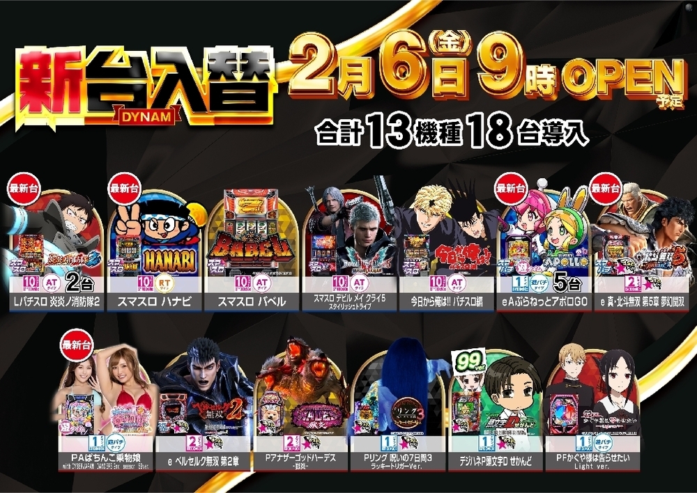 2月6日(金) 新台入替!! 全13機種18台導入(予定) |