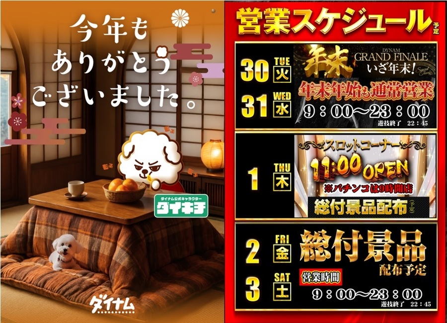 12/29(月):9時開店~23:00まで。今年の打ち納めにいかがでしょうか。