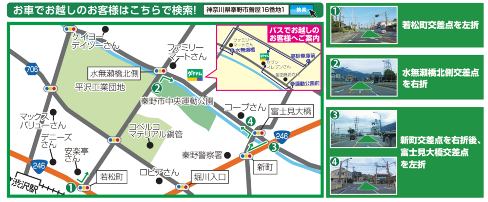 伊勢原方面からのお客様 国道246号 新町交差点を右折 ↓ 富士見大橋交差点を左折 ↓ 右手に店舗があります