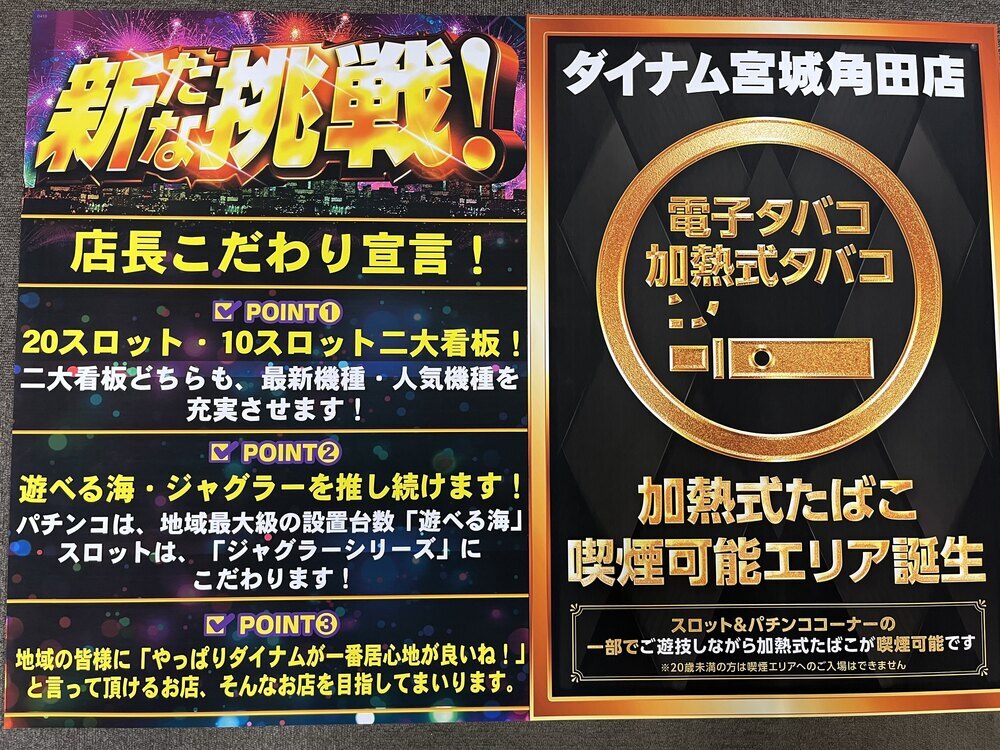 2月13日(金)より、「加熱式たばこ喫煙可能エリアが誕生!」します。たばこを吸う方も吸わない方も、気兼ねなく楽しめる店舗環境を目指してまいりますので、どうぞ、今後のダイナム角田店をよろしくお願い致します。
