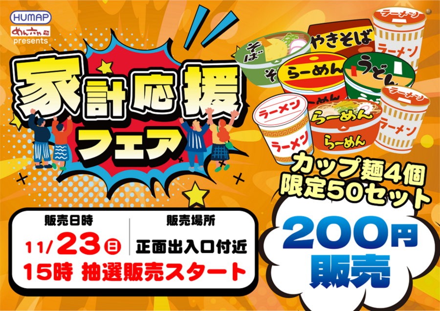 11月23日(日)は「家庭応援フェア カップ麺販売」を開催いたします![]()