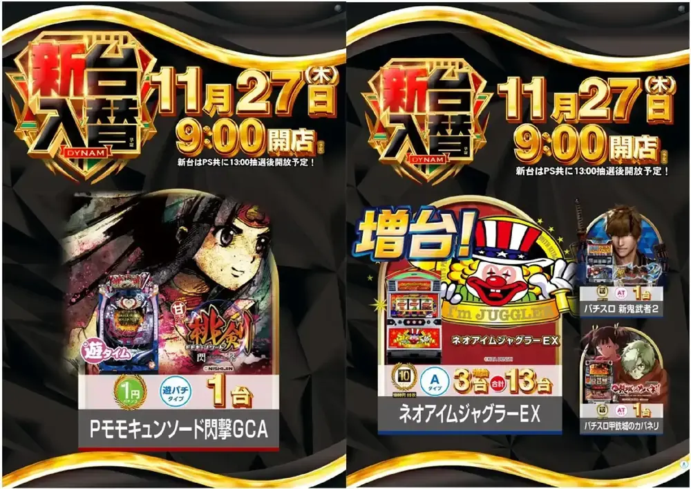 新台の開放時間はPS共に13:00頃開放となります。 また、開放時間に新台をご遊技希望のお客様へは 抽選会を実施します。 あらかじめ、ご了承くださいませ
