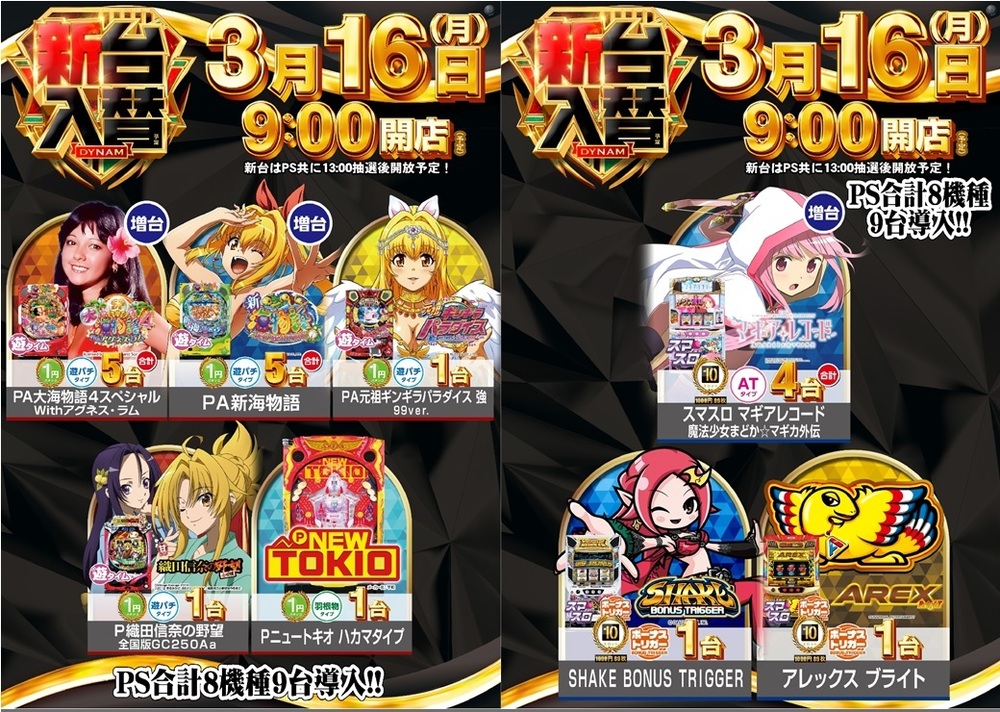 新台の開放時間はPS共に13:00頃開放となります。 また、開放時間に新台をご遊技希望のお客様へは 抽選会を実施します。 あらかじめ、ご了承くださいませ