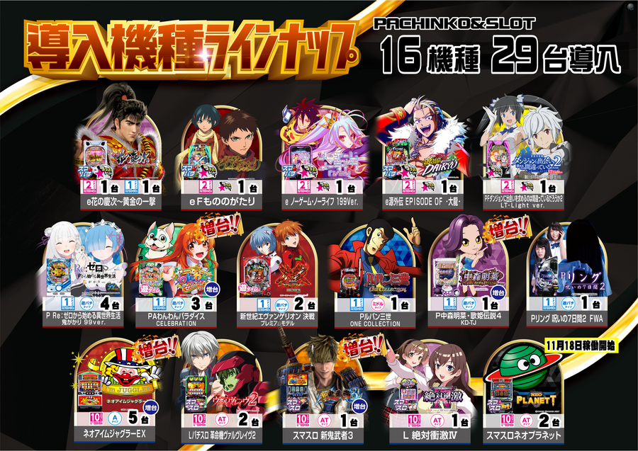 パチンコ・スロット、16機種29台導入